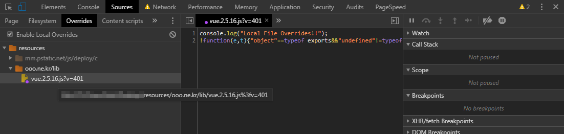 이럴 때 Chrome 브라우저의 Overrides 기능을 사용하면 Local Server에서 작업하는 것 같은 편안함을 느낄 수 있다.