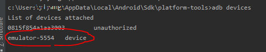 3) adb devices 명령어로 현재 구동 중인 에뮬레이터를 확인한다.